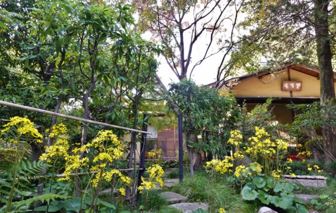 聚楽園公園嚶鳴庵の庭にはツワブキの花が見頃になっていました 黄葉も進んできてもうすぐ見頃になりそうですね